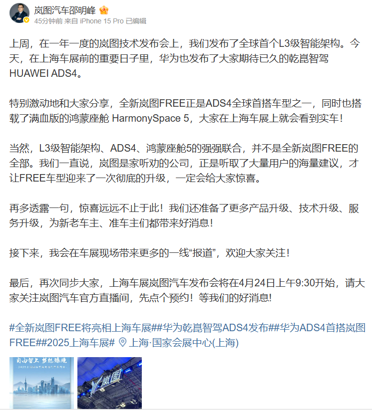 邵明峰微博补充到,此次上海车展,岚图还为用户带来三重升级——产品升级、技术升级和服务升级,而且今年岚图会有非常多的大动作。