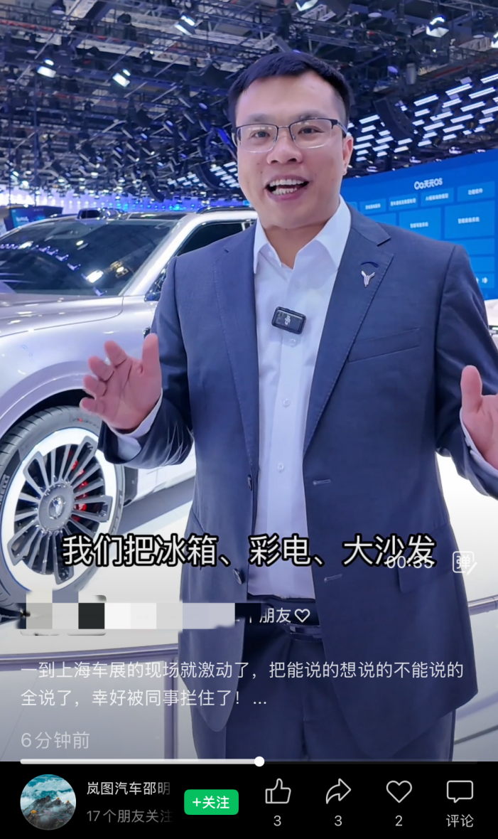 值得注意的是,邵明峰还通过社交平台表示,上海车展现场岚图还将推出另一重磅力作,将在4月24日上午9:30官方直播间正式亮相。