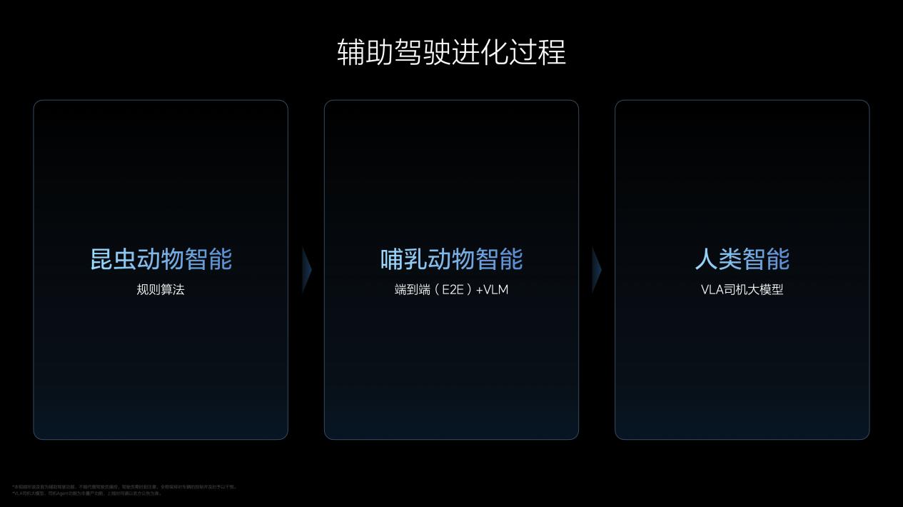 VLA的实现不是一个突变的过程,是进化的过程,经历了三个阶段,对应理想汽车辅助驾驶的昨天、今天和明天。第一阶段,理想汽车自2021年起自研依赖规则算法和高精地图的辅助驾驶,类似“昆虫动物智能”。第二阶段,理想汽车自2023年起研究,并于2024年正式推送的端到端+VLM(Vision Language Model,视觉语言模型)辅助驾驶,接近“哺乳动物智能”。