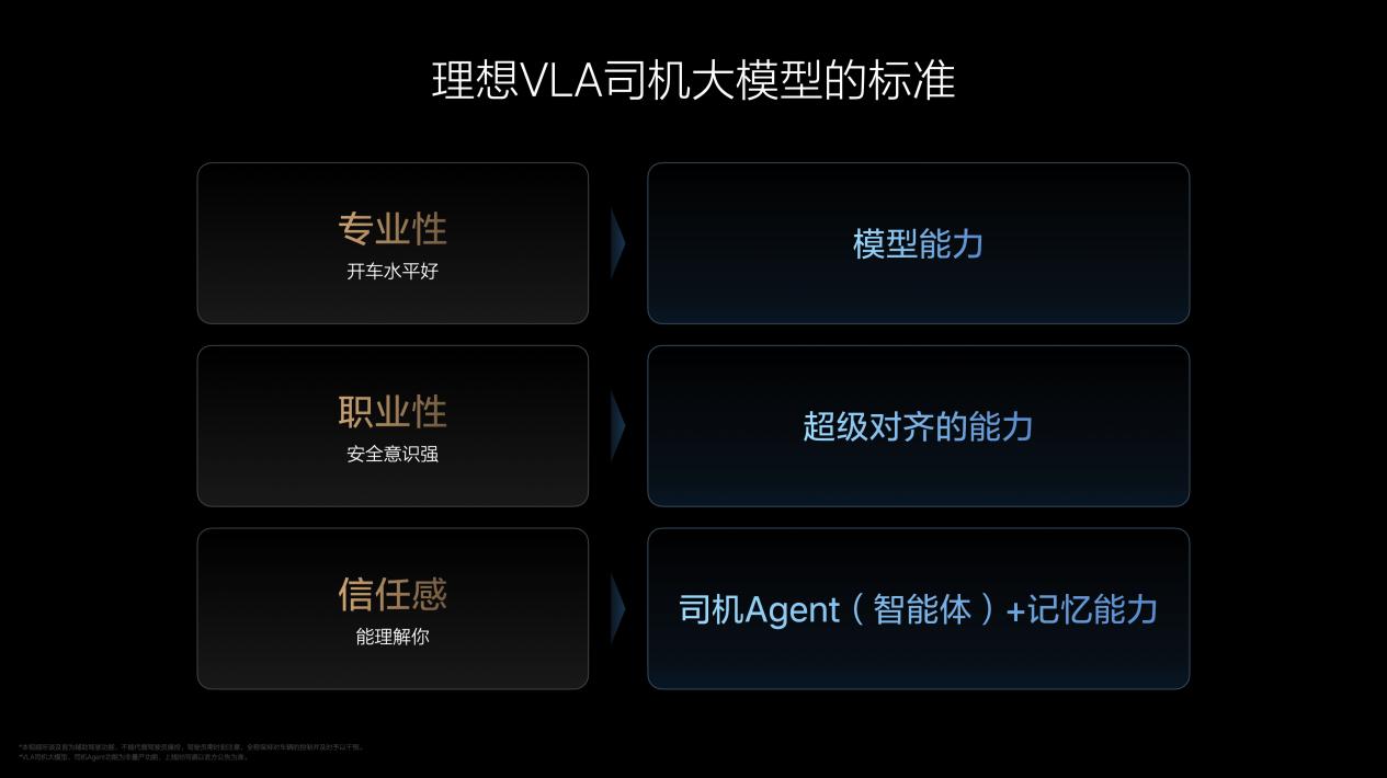 判断司机Agent是否是个好司机,有三个关键标准:专业能力、职业能力和构建信任的能力。VLA司机大模型提升了专业能力,超级对齐增强了职业能力,VLA通过理解自然语言、具备记忆能力提升了构建信任的能力。