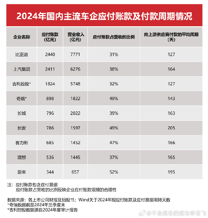 对于外界质疑的供应商应付款问题,李云飞也进行了详细的说明。他解释称,企业规模越大、营业收入越高,对外采购与合作的体量也会越大,这本身是企业拉动经济增长的重要体现。比亚迪的应付账款为2440 亿,上汽是2411 亿、吉利是1824亿。但更为关键的是应付账款占营业收入的比例,比亚迪为31%,吉利是32%、上汽是38%、长城是39%,比亚迪在这项指标上表现优异,说明其未支付的货款比例相对较低。
