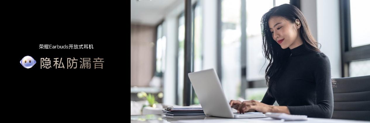 荣耀Earbuds开放式耳机支持业界首发3Mic+骨传导开放式混合降噪系统,融合AI降噪算法,智能滤除环境噪声,让噪音一键“闭麦”,即使在6m/s强风环境下仍可保持通话清晰;还支持开放式主动降噪,在办公等场景下免受噪声干扰;另外还搭载隐私防漏音技术,通过逆声场声学技术实现定向传音,即使在电梯间或者会议室,也能安心畅聊,不怕泄露隐私。