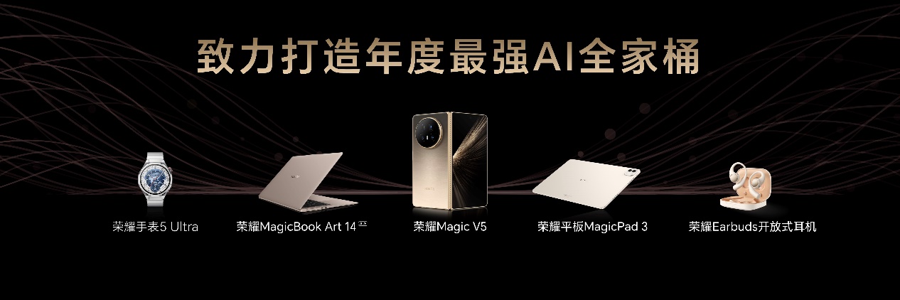 此外,本次发布会荣耀还带来AI终端生态家族的全家桶旗舰新品。全球最薄、地表最强折叠屏荣耀Magic V5,以突破性的制造工艺和技术创新、全面满血的旗舰性能配置,以及AI智能体的多功能应用、多生态覆盖,再次定义折叠旗舰新标准。荣耀MagicBook Art 14 2025上线一语智控功能,实现“搜阅创控”全链路多任务一句话操作,开启AI PC自动驾驶时代;荣耀平板MagicPad3 13.3英寸大屏旗舰平板,首发全局AI 生产力,业内首次实现与iOS、鸿蒙、安卓系统手机无缝互传,打造大屏旗舰最强AI平板;钛合金蓝宝石高端旗舰手表荣耀手表5 Ultra首发防猝筛查研究,24小时守护心脏健康,重新定义腕上智能健康。