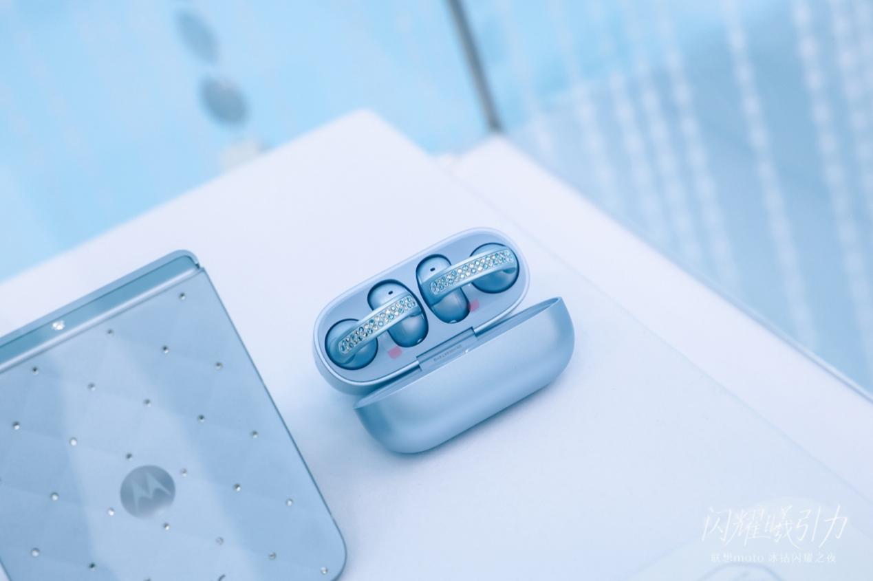 礼盒中另一闪耀成员——联想moto buds Clip冰钻限定版耳机,同样承袭璀璨基因。耳机采用冰钻镶嵌设计,奢感十足,不仅提供高品质的Bose调校音质体验,更是一件点亮耳畔的时尚耳饰,与冰钻小折叠手机相得益彰,共同演绎潮流风尚。