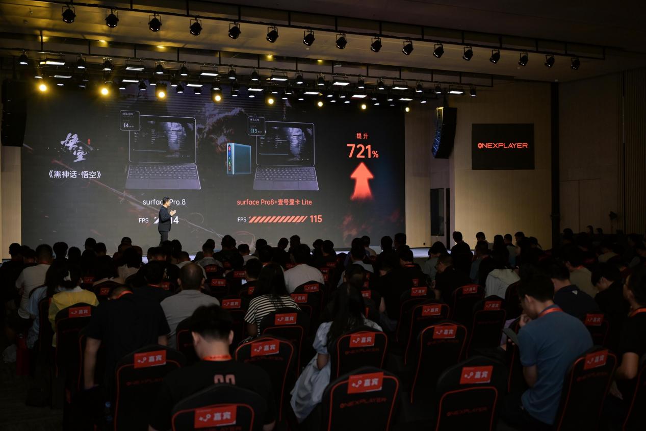 现场演示中,游侠X1 Air在未接显卡前运行《赛博朋克2077》的帧率是45帧,接上ONEXGPU Lite后,帧率瞬间飙升到90帧。