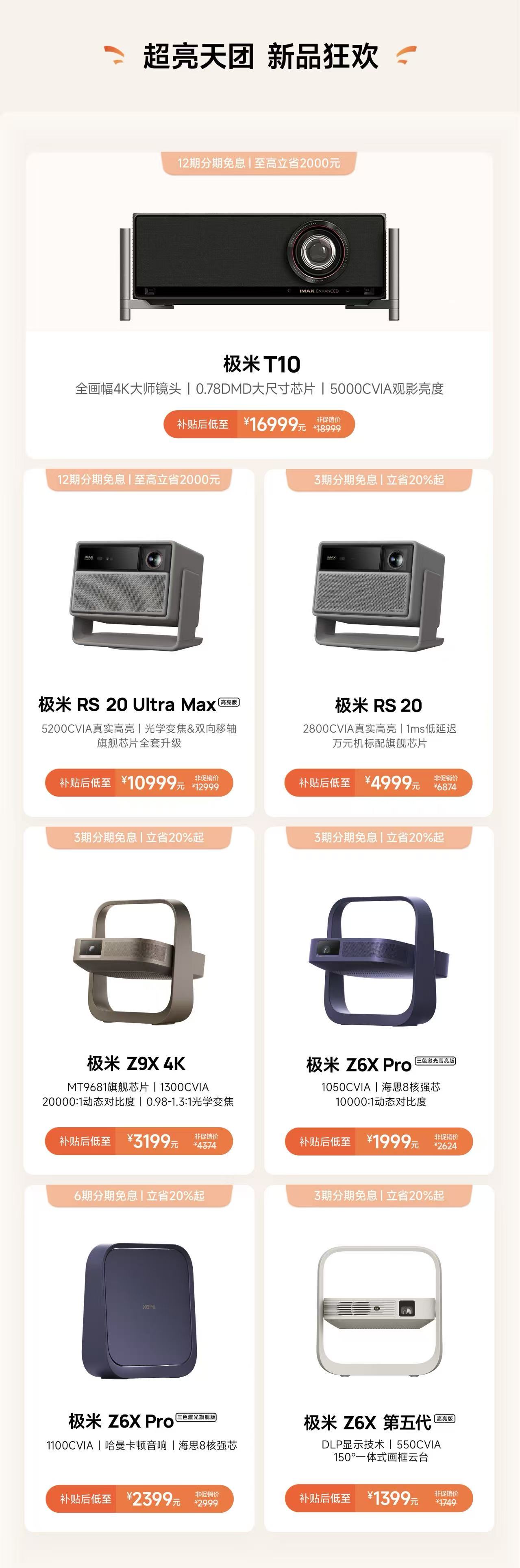 本次双十一,极米诚意满满,真补贴、强质保,让消费者买得放心、省得开心。极米携手各大电商平台同步开启促销活动,全线产品“补上加补”,部分机型至高立省2000元。更有至高24期分期免息、晒单赠芒果TV会员卡等福利加码。