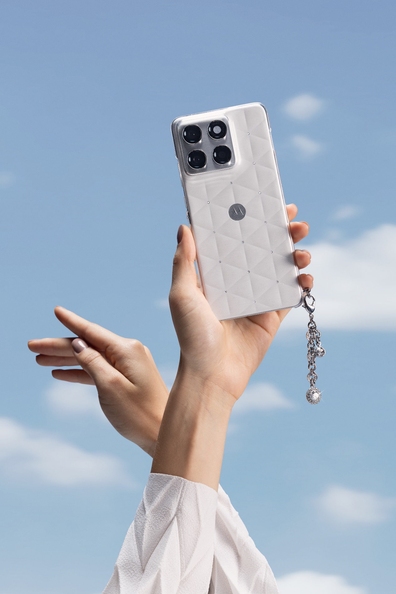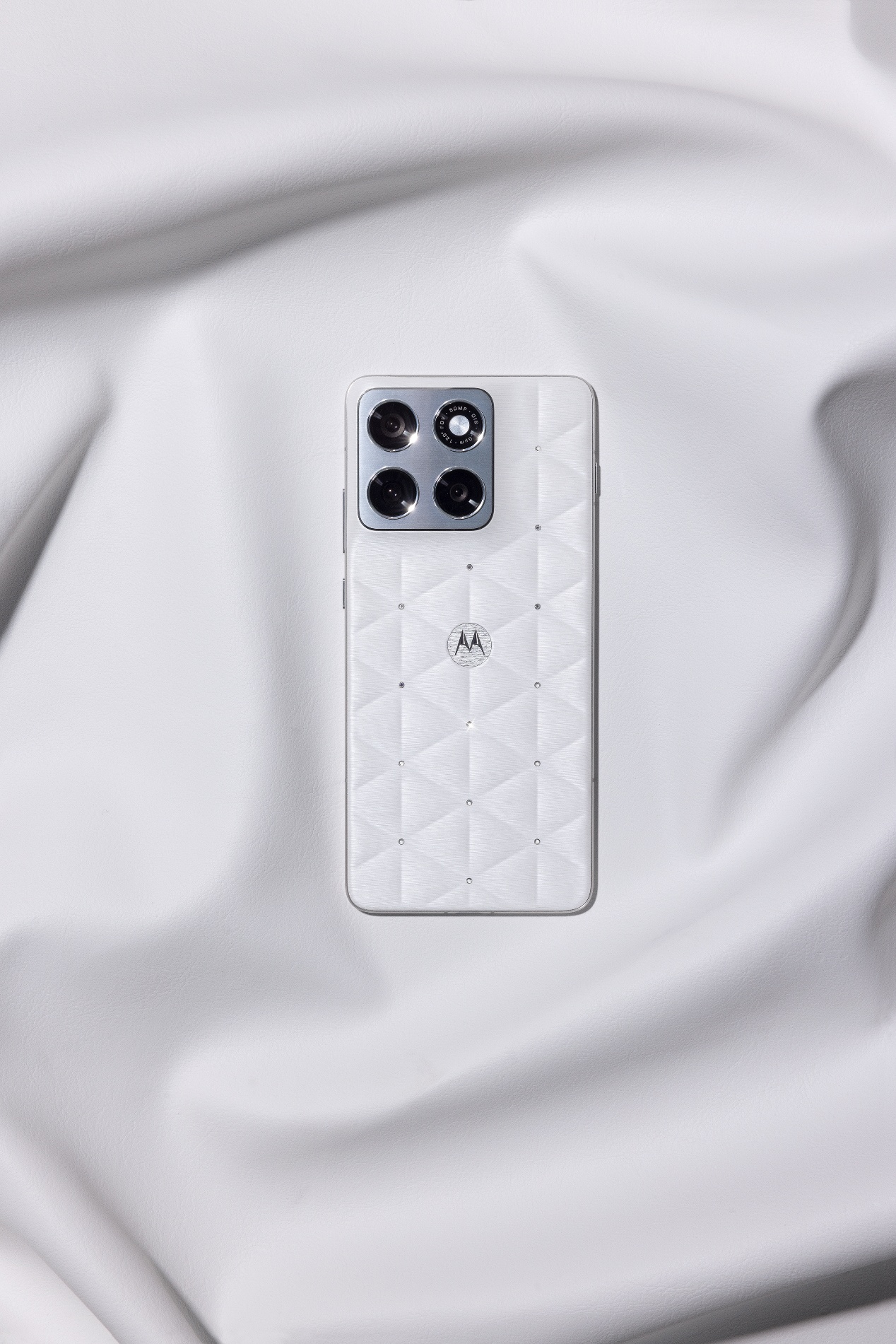 联想moto X70 Air云上舞白冰钻限定版以“云舞”之名,重新想象“轻薄”,是目之所及,属于天空的诗意;更是身之所感,摆脱重量的自由舞姿。机身采用立体三角形格纹工艺,设计灵感源自钻石切割工艺,每个线条交点上,共手工镶嵌14颗施华洛世奇冰钻,每颗冰钻均含9个切面,交错线条如钻石火彩般流动闪耀,纯素皮表面精心雕琢立体丝绸纹理,呈现柔软的高级触感与视觉体验,演绎“云上高定”美学理念。