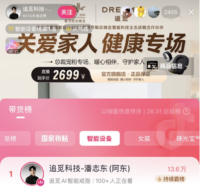从市场表现来看,追觅AI智能戒指上线两个月即登顶天猫智能戒指热销榜TOP1,抖音平台同样拿下智能戒指带货榜TOP1,抖音电商智能戒指带货榜与天猫智能戒指热销榜双榜长期占据榜首。此外,追觅全球AI硬件事业群总裁潘志东的抖音直播间也表现亮眼,多次登顶抖音智能设备品牌同时段TOP1。2026年第一季度,全渠道GMV环比增长616%,在智能穿戴赛道中展现出强劲的增长动能,成为兼具产品力与商业化能力的代表性单品。