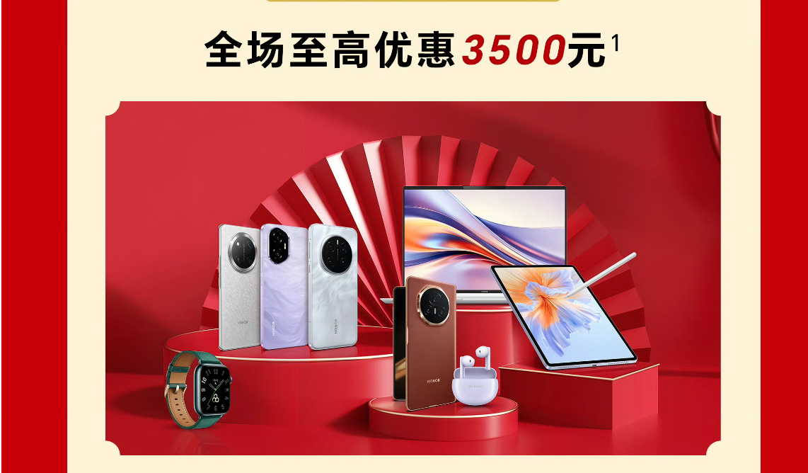 活动期间,消费者可先享受荣耀魔法科技年货节3500元全场至高优惠,在此基础上再叠加使用国家补贴,实现折上折优惠购机,大幅降低购机成本。此次参与补贴的机型阵容庞大,涵盖了荣耀旗下多品类、多系列的热门机型。手机品类中荣耀Magic V Flip、荣耀Magic7系列、荣耀Magic6系列、荣耀300系列、荣耀X60系列等纷纷在列,国补加厂补至高优惠1400元;PC品类里,荣耀MagicBook Pro 16、荣耀MagicBook Art 14等享国补加厂补至高优惠2000元;还有荣耀平板MagicPad2、荣耀手表5等产品也被纳入了补贴范围,价格亲民。