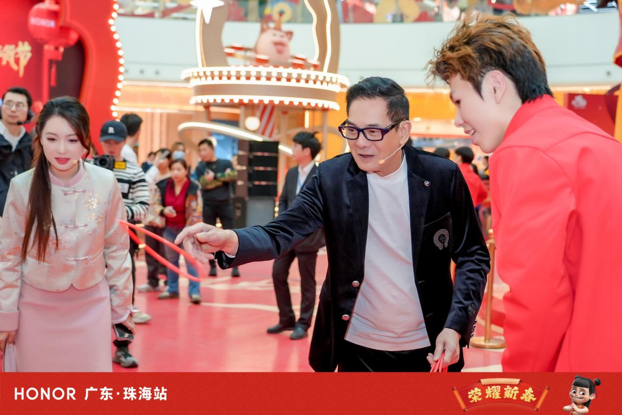 活动现场精心安排了丰富的传统文化表演,以国风滚球舞拉开序幕,醒狮点睛和舞狮表演更将活动氛围推向高潮。知名香港演员、科技爱好者李国麟也惊喜现身,并在荣耀手机官方直播间参与互动。李国麟亲身体验荣耀手机的各项AI功能后,对其赞不绝口。