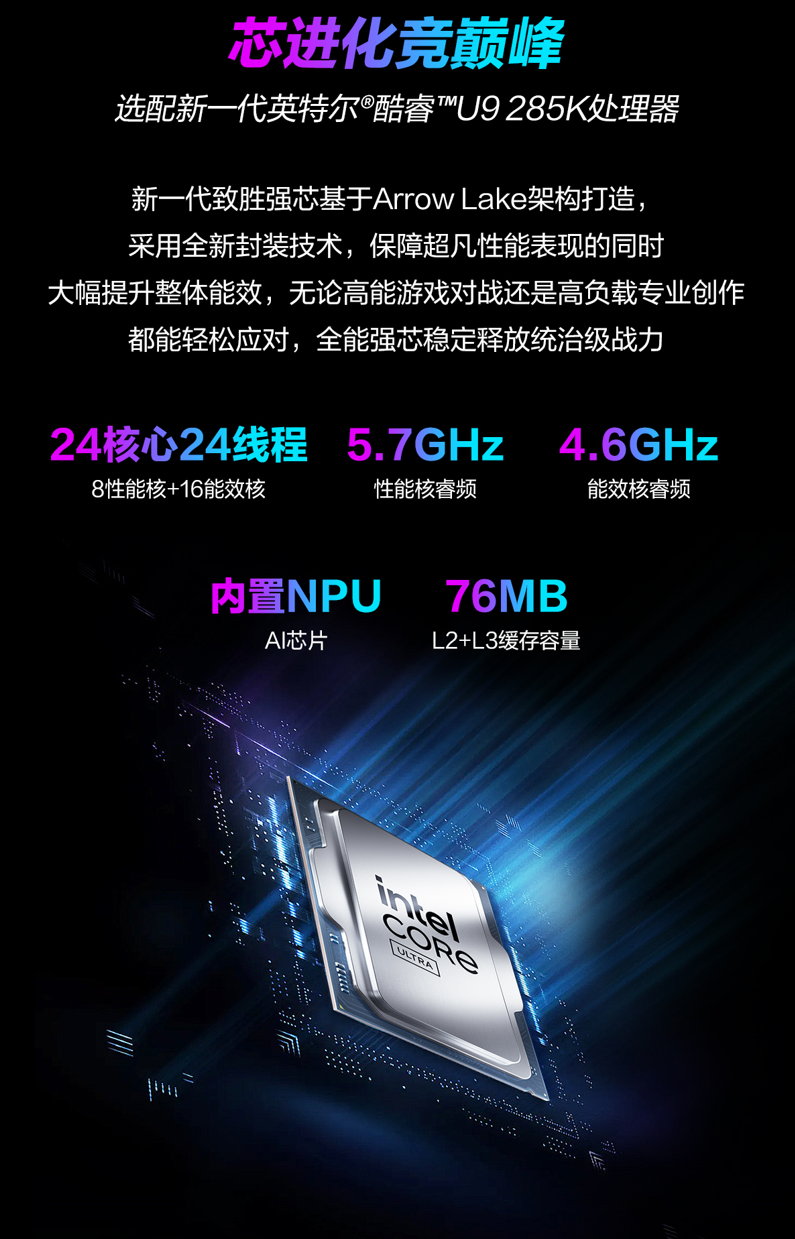 ROG魔霸9X作为电竞台机的新标杆,首先在处理器方面就实现了全面突破。它搭载了全新的Intel酷睿U9 285K处理器,其基于全新Arrow Lake架构打造,采用全新封装技术,拥有24核24线程,最高睿频5.7Ghz,L2+L3缓存容量高达76M,拥有超凡制胜性能,整体功耗表现也十分出色,无论是高能游戏对战还是高负载专业创作都能轻松应对,全能强芯稳定输出狂暴战力。