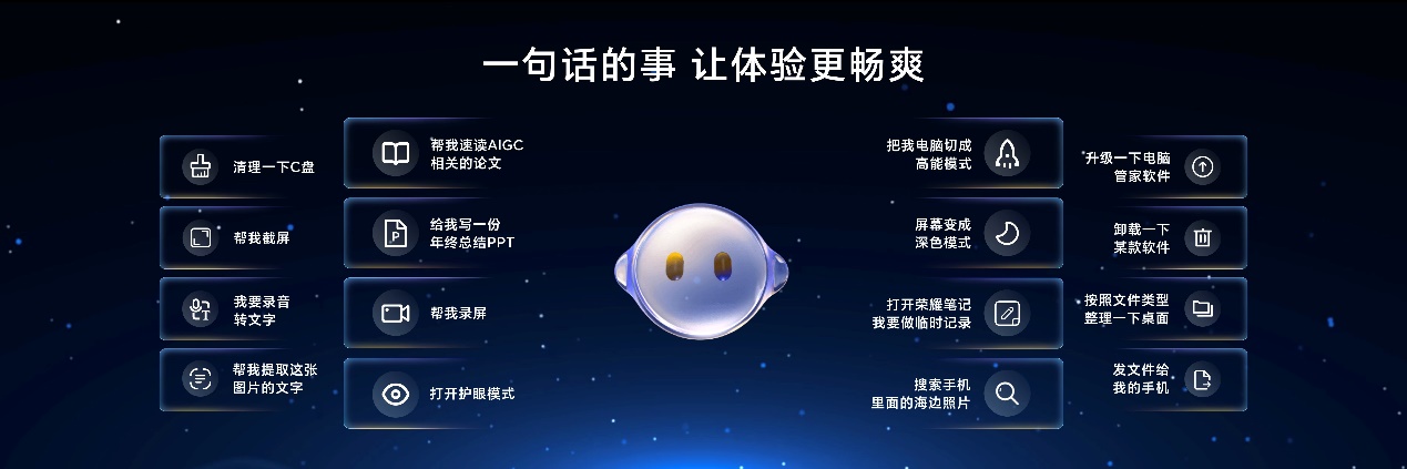此外,荣耀手机上大受好评的“一句话的事”AI交互体验也将落地荣耀AI PC,用户只需通过自然语言交流,即可让YOYO助理2.0完成复杂的任务执行,比如硬盘清理、软件卸载、文件发送等,让PC也进入“AI自动驾驶”时代。