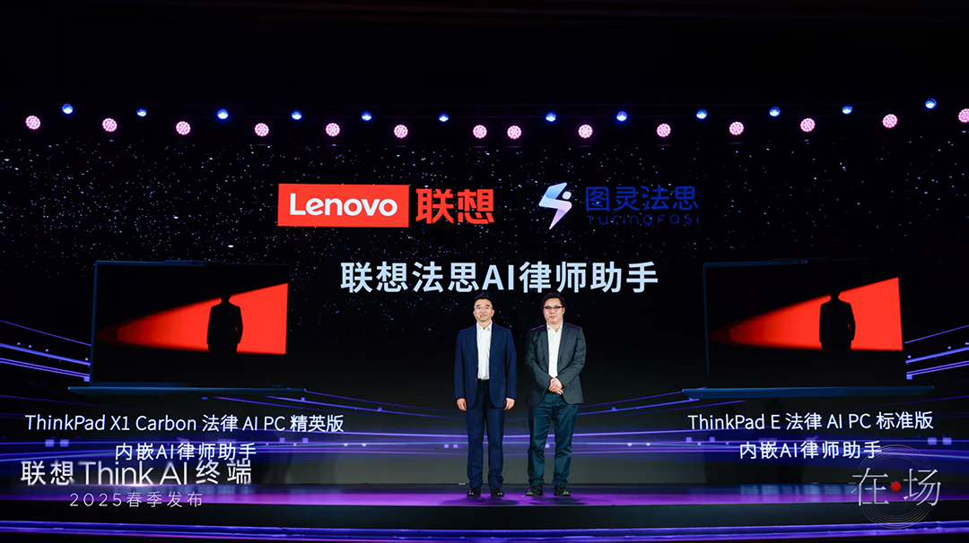 在发布会上,联想还推出了内嵌联想法思AI办案助手的ThinkPad X1 Carbon 法律AI PC精英版和ThinkPad E 法律AI PC基础版,覆盖获客营销、案情理解、模拟抗辩、庭审分析等全流程思维链服务,最大化提高工作效率。