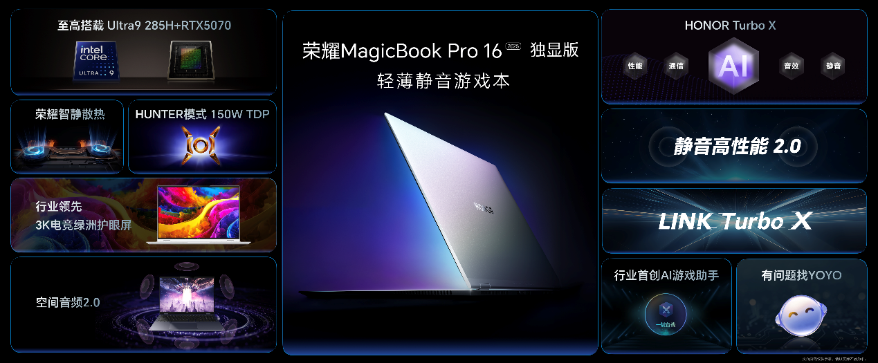 荣耀的AI终端生态建设,始终遵循“场景先行”的逻辑。此次发布的星辰灰配色MagicBook Pro 16,在保留1.86kg轻薄机身的同时,通过接口升级(HDMI 2.1-FRL+雷电4)与1TB固态硬盘标配,模糊了游戏本与商务本的界限;新增的AI游戏管家功能,更将设备从工具进化为“智能伙伴”——一键备战、边玩边搜、高光时刻生成,这些功能看似服务于游戏,实则是AI技术向日常场景渗透的缩影。