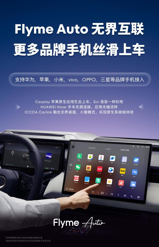 发布两年多以来,Flyme Auto 已接入领克、银河、吉利等多个品牌的23款车型,成为搭载车型数量TOP1的智能座舱操作系统,目前正在积极推进与更多国内外智能汽车品牌合作。