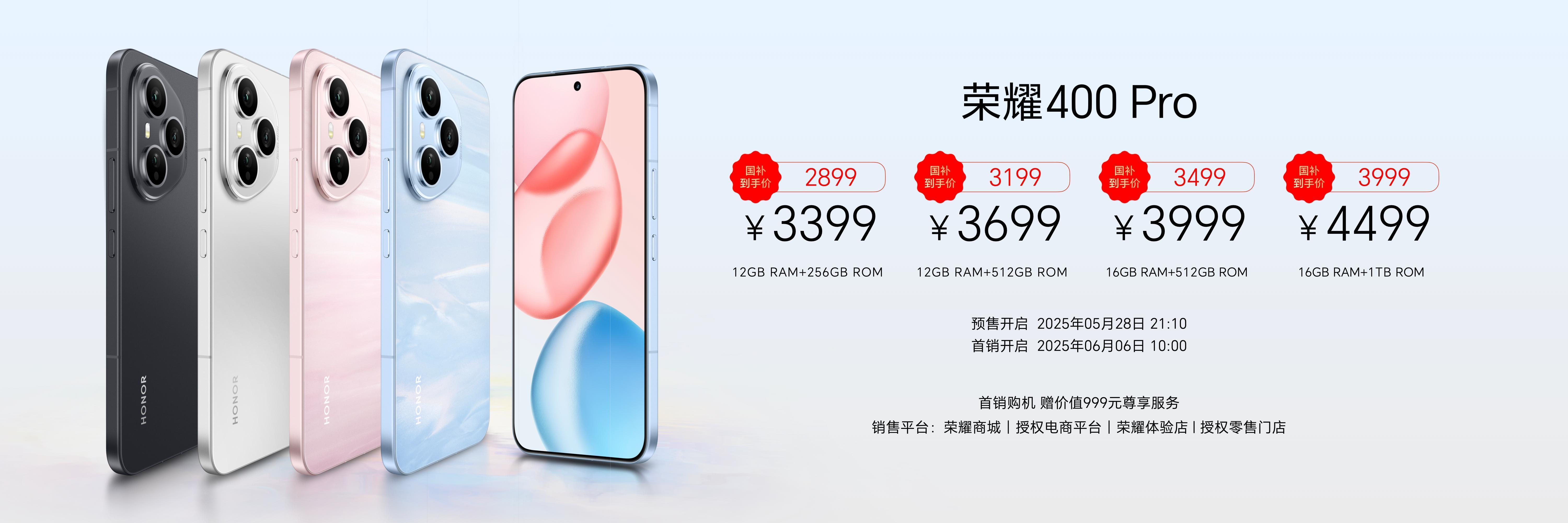 据了解,荣耀400系列共两个版本,分别为荣耀400与荣耀400 Pro,国补后起售价分别为2124.15元、2899元,目前已经开启预约,6月6日10:00全渠道正式开售。