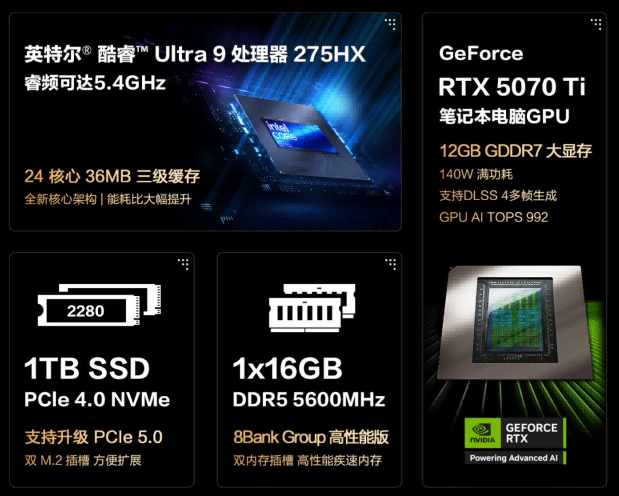 ROG枪神9 Plus电竞本凭借硬核高性能配置,为《燕云十六声》的武侠开放世界提供极致体验。搭载英特尔酷睿Ultra 9 275HX处理器(24核24线程,5.4GHz睿频)与140W满功耗RTX 5070Ti笔记本电脑GPU,支持DLSS4与光线追踪,轻松驾驭游戏内竹林光影、千人同屏的市井场景及复杂的地下暗渠渲染。