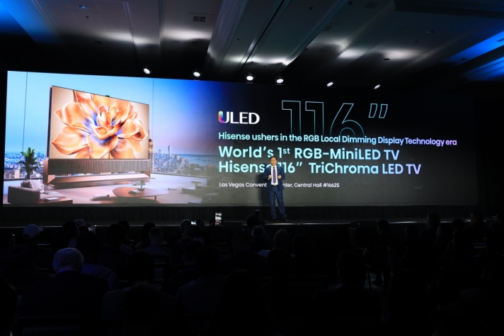 北京时间1月7日凌晨,CES 2025展会开幕前,海信举办了2025显示技术发布会,全球首发RGB三维控色液晶显示技术,同时还在CES展出了应用该项技术的116英寸全球首台也是全球最大的RGB-Mini LED电视。