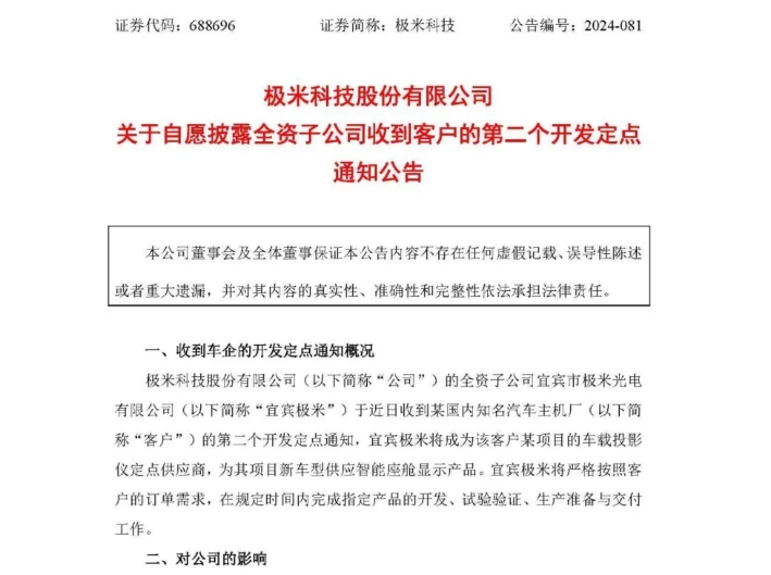 12月30日晚间,极米科技发布公告称,其全资子公司宜宾市极米光电有限公司于近日收到国内某知名汽车主机厂的第二个开发定点通知,将为其新车型供应智能座舱显示解决方案。