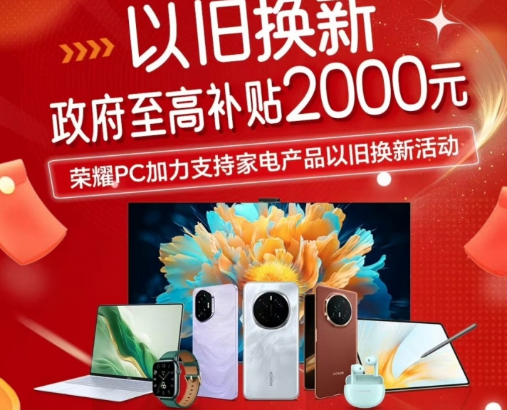 荣耀作为科技行业的领军品牌,率先加入国家补贴计划,旗下手机、平板、智能手表手环等按产品销售价格的15%给予补贴(单件售价在6000元以内,每件补贴不超过500元),