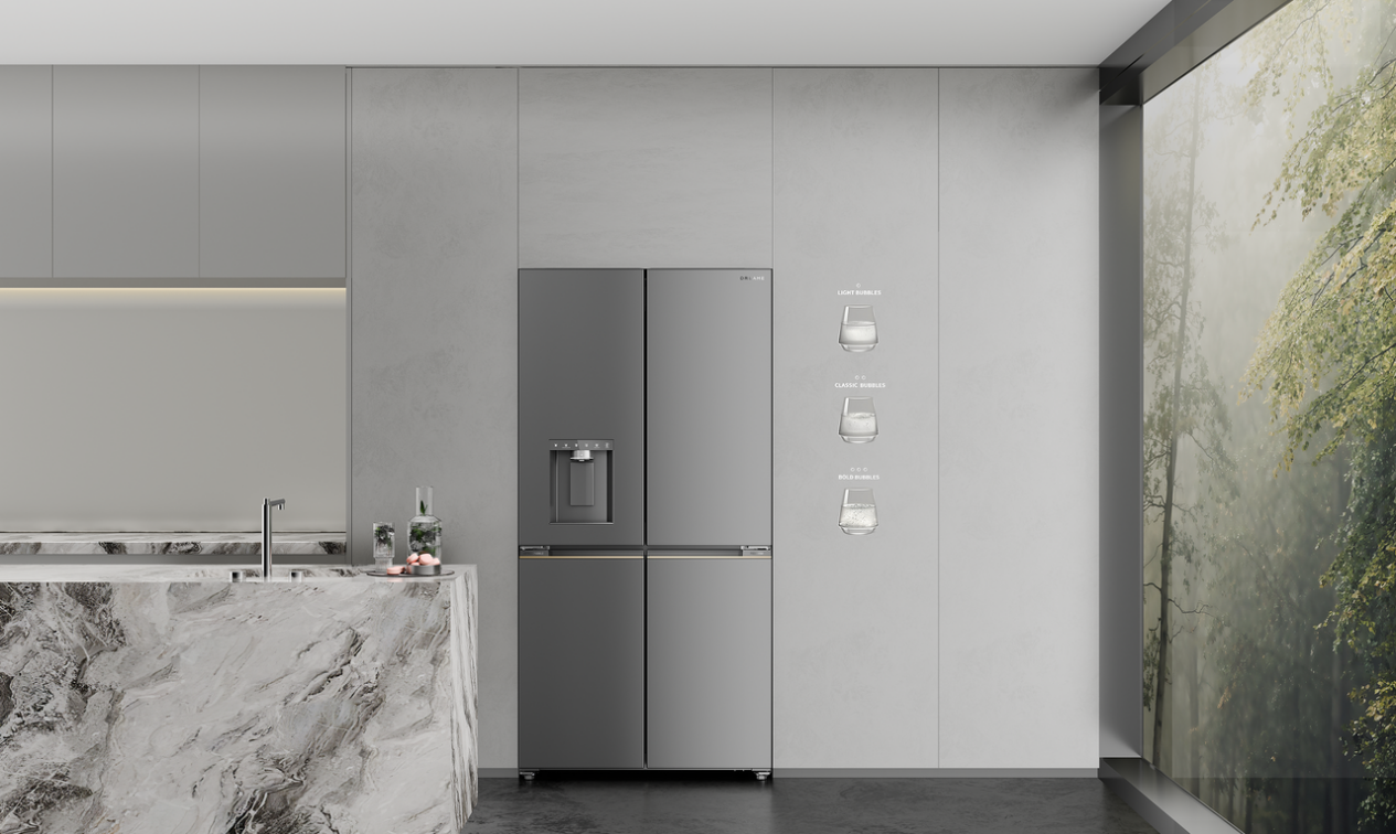 追觅冰箱此次首发的FizzFresh™即饮气泡水冰箱创新整合自研SparklingBar™气泡水系统,将气泡水制作模块巧妙集成于冰箱门体,用户轻触分配器即可一键获取冰爽气泡水,支持三档气泡强度调节(轻盈/经典/浓郁),适配咖啡、鸡尾酒等多元场景。该系统通过管道供水与独立水箱双方案实现“即装即用”,据测算可为三口之家十年减少约10,950个塑料瓶使用,节省超5,110欧元开支,该产品斩获日本Good Design Award 2025国际工业设计大奖。针对北美家庭对大容量存储的需求,MegaPro超薄大容量系列通过超薄发泡层与嵌入式风道设计,在同等尺寸下实现容积提升17%-19%,完美适配紧凑型厨房空间。同步亮相的智能制冰机矩阵支持立方冰、碎冰双形态,日产量达1.2kg,搭配AI温控系统动态调节冰块硬度,满足全场景冷饮需求。