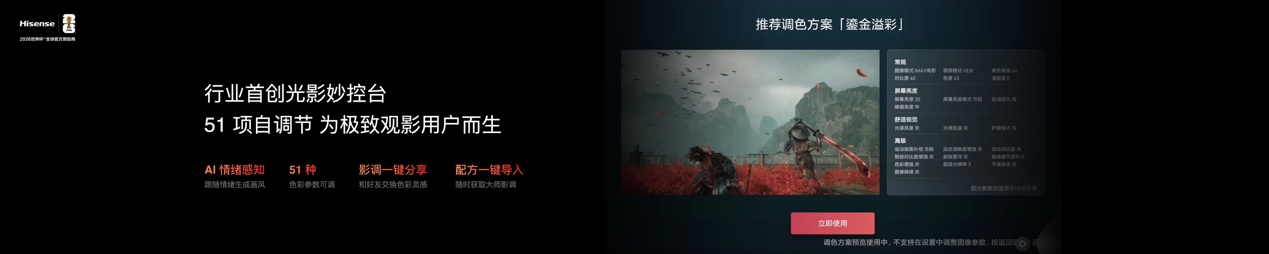 玲珑真彩背光作为海信专为RGB-Mini LED定制的光学系统,完成了光源、光型、阵列、算法的四重重构,从物理源头奠定了画质优势。海信E7S Pro搭载的全自研车规级高光效RGB发光芯片,实现了三原色独立直出,无需量子点中间介质,轻松达成100% BT.2020原生色域,配合△E<0.7的超高色准与100%的色彩纯度,让屏幕还原出最接近大自然的真实色彩。海信E7S Pro的玲珑真彩背光系统拥有7560控色分区与5100nits超高亮度,实现了“1 区控色>3 区控光”的行业突破,相较传统单色背光显示技术仅能控制亮暗,海信E7S Pro可对每个分区的色彩与亮度进行独立精准调节,画面细节与色彩层次提升3倍以上。同时,通过微纳级匀光透镜与独创的RGB非对称光源旋转阵列,光晕降低60%,物理根除串色、偏色问题,即便在暗场字幕、高亮晚霞等复杂场景下,也能实现画面纯净通透无杂光。车规级的发光芯片,有效使用寿命突破16万小时,可稳定使用超过15年,彻底告别传统单色背光电视的色衰焦虑。