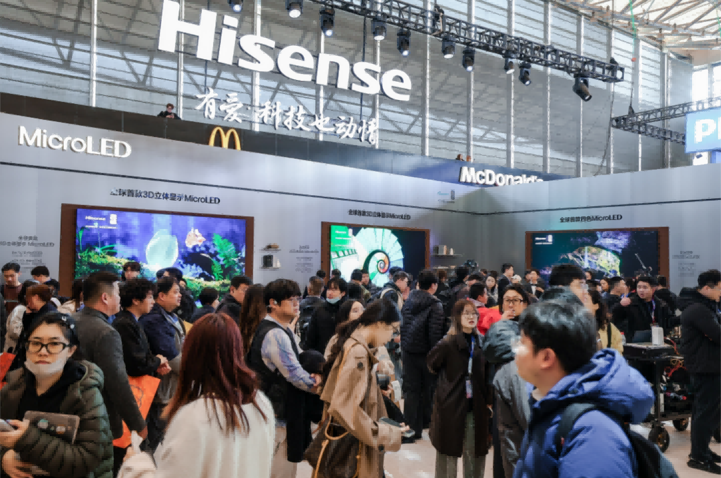凭借显示技术的全面突破,海信电视得以构建起行业领先的百吋产品矩阵。在AWE现场,从RGB-Mini LED电视、Micro LED巨幕到激光电视的全线100吋及以上新品阵容悉数亮相,成为现场焦点。据统计,2025年海信百吋电视全球出货量份额49.6%,每售出两台百吋电视就有一台是海信;海信提出电视选购已由“按照观看距离选尺寸”进化到“按照电视墙面选电视”,电视WALL时代已来临。