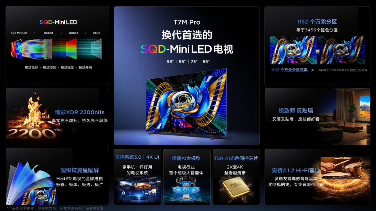 TCL的选择是反向操作。T7M Pro国补后5000元档起,T7M Ultra国补后6000元档起。这个价格放在两年前,只能买到一台普通LED电视;放在一年前,勉强够到入门级Mini LED的门槛;而今天,它对应的是一套完整的SQD-Mini LED技术方案——万象分区、100% BT.2020色域、超级蝶翼星曜屏、绚彩XDR高亮。