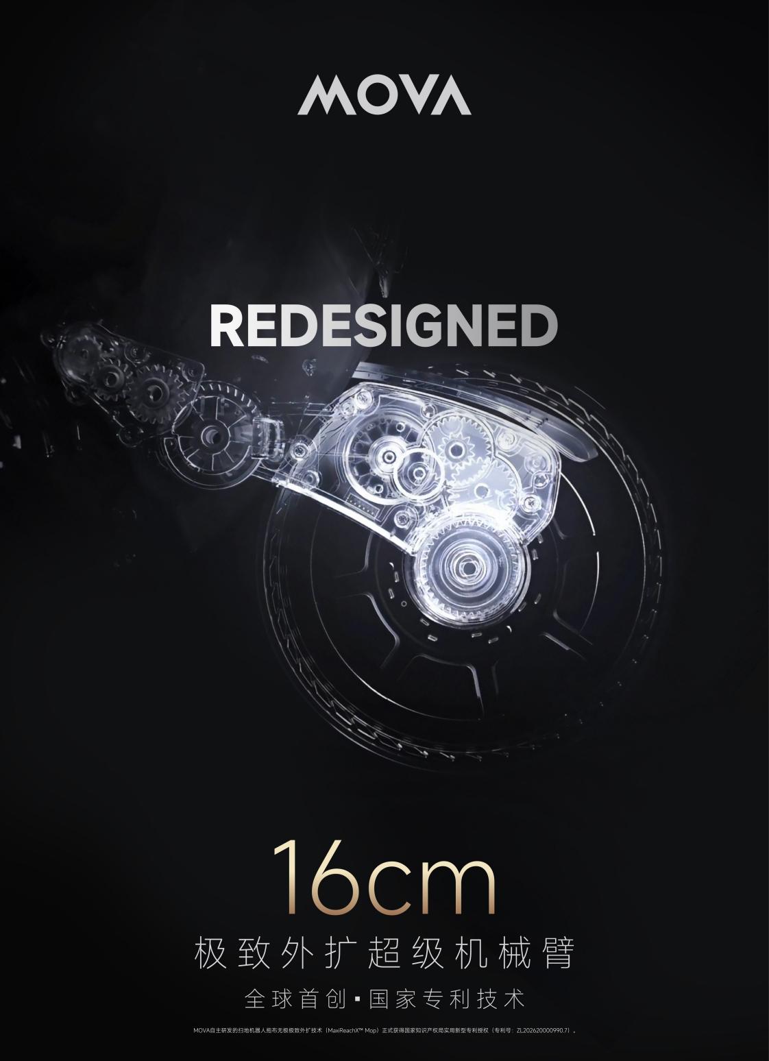 近日,全球高端创新智能家电品牌MOVA自主研发的扫地机器人拖布无极极致外扩技术(MaxiReachX™ Mop)正式获得国家知识产权局实用新型专利授权(专利号:ZL202620000990.7)。该技术以全球首创的16cm极致外扩超级机械臂为核心,首次在扫地机器人领域建立了可脱离机身限制进行地面清洁的技术路径,使扫地机器人的清洁方式从“机身进入空间”转向“清洁结构主动延伸进入空间”,让清洁单元不再受限于整机尺寸。