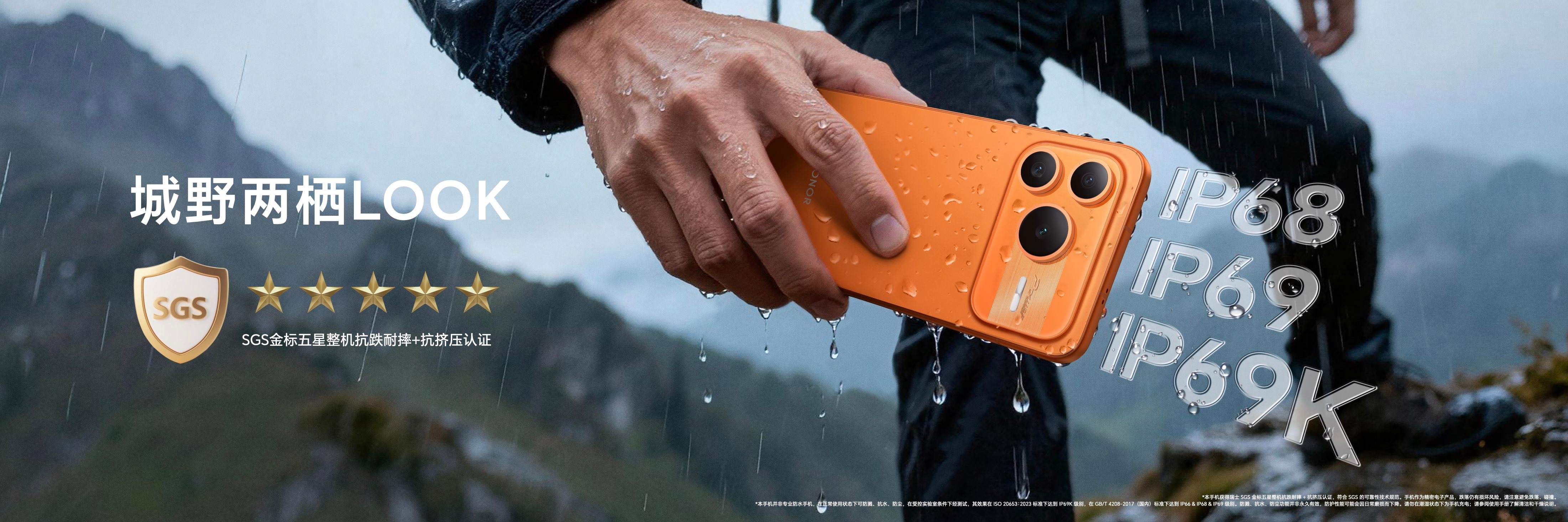 荣耀Power2打造了强大的机身可靠性,机身中框采用四角榫卯卸力设计,抗摔能力提升25%,抗弯能力提升22%,整机通过SGS金标五星整机抗跌耐摔+抗挤压认证。同时,其还具备IP68+IP69+IP69K满级防尘防水,支持超高温、超时长、任意种类防水以及10000+次反复入水无忧四重防护,即使在极端户外环境也能轻松应对。