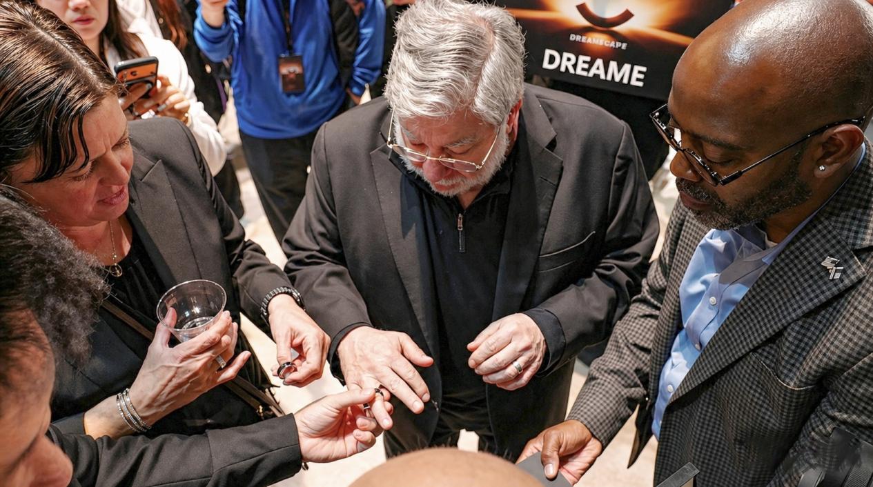 (图中:苹果联合创始人Steve Wozniak试戴追觅AI智能戒指)